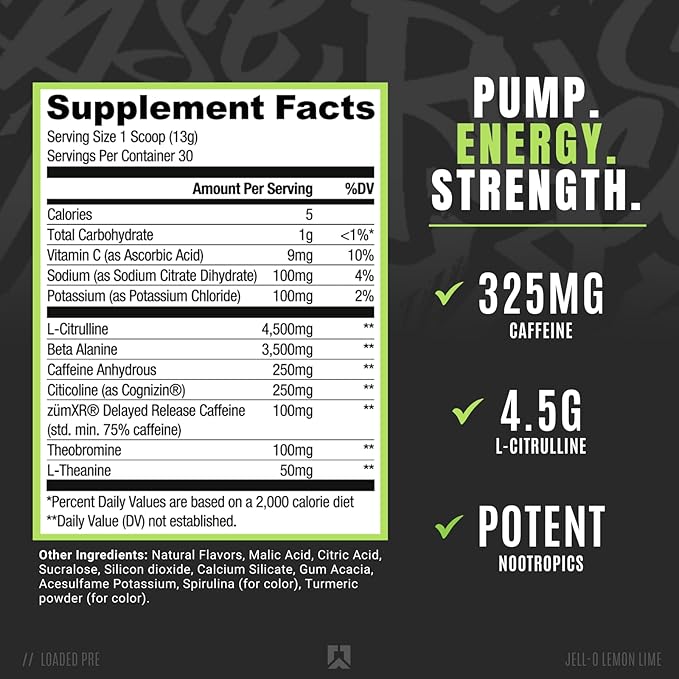 Ryse Loaded Pre Workout Powder Supplement for Men & Women | Pumps, Energy, Focus | Beta Alanine + Citrulline | 325mg Caffeine | 30 Servings (Jell-O Lemon Lime)