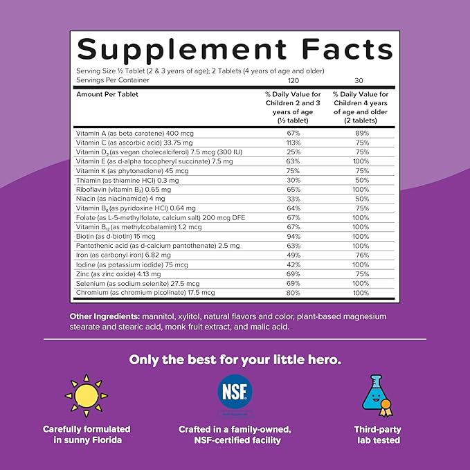 - How to take: Children 2-3 years old take 1/2 tablet daily; children ages 4 and older take 2 tablets daily; our vitamins melt in your kids’ mouth or can also be dissolved in water, juice or even smoothies. Kids can chew them or let them melt without worrying of anything getting left behind on their teeth
