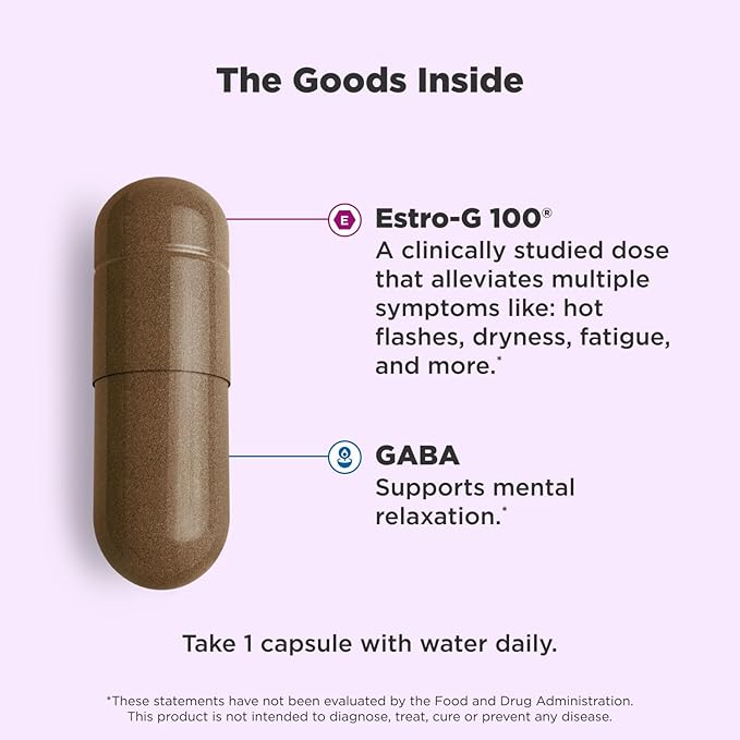 - THE GOODS INSIDE: Clinically studied EstroG-100 to help relieve menopausal symptoms including vaginal dryness, fatigue, hot flashes, night sweats and trouble sleeping—even occasional mood swings and irritability*