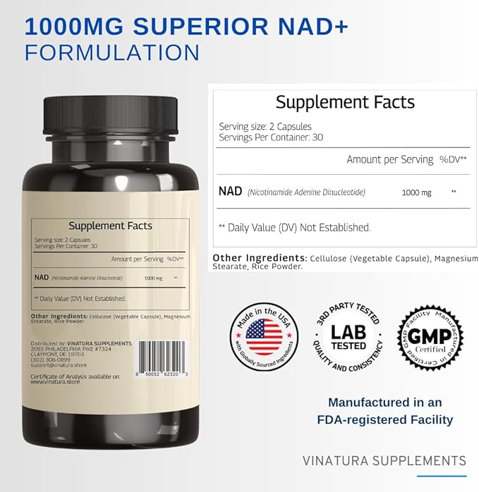- NAD SUPPLEMENT 1000MG, SUPERIOR NAD+ FORMULATION - VINATURA's advanced NAD+ supplement delivers 1000 mg of NAD+ per serving. Each bottle includes 60 capsules, providing a complete 30-day supply. VINATURA offers one of the most potent NAD supplements for women and men.