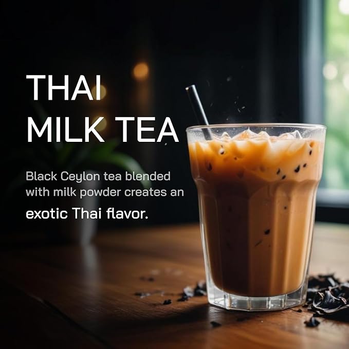 - Indulge: Exotic Thai Milk Tea Flavor. Savor the rich taste of Ceylon black tea and milk powder perfectly blended. This distinctive twist lifts the exotic flavor and cheer to those who seek a bold and invigorating life.