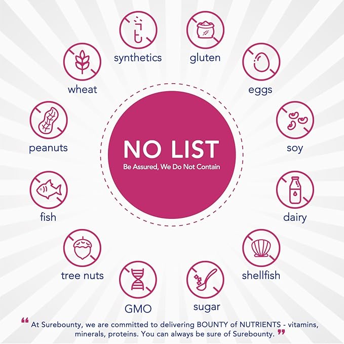 - No Allergens or Nasties: Surebounty has always been dedicated to formulating supplements that cater to people from all walks of life and can easily fit into their daily routines. We want you to enjoy the amazing benefits brought by our products without worrying about getting allergic. Be Assured: NO GMOs, soy, gluten, milk, sugar, egg, wheat, corn, nut, fish, shellfish. And never will you find Nasties like artificial ingredients, fillers, binders, or preservatives in Surebounty!