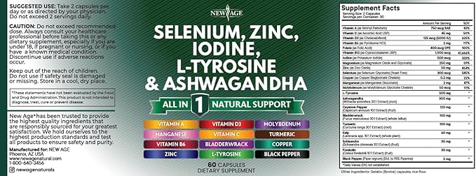NEW AGE Selenium, Zinc, Iodine, L Tyrosine, Ashwagandha - Supplement for Women and Men with Bladderwrack, Turmeric, Silica Kelp, Schisandra - 120 Count
