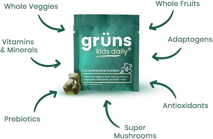 - A Gummy that Fills the Gaps: Gruns Super Greens Gummy Bears is a greens powder alternative carefully formulated with 60 potent ingredients such as whole fruits, veggies, super mushrooms, prebiotics, adaptogens, and more to offer effective nutrition in one product. The ingredients in this fresh, light Strawberry/Sweet Green flavored gummy can help improve your gut health, support immunity, promote recovery, and strengthen mental focus.