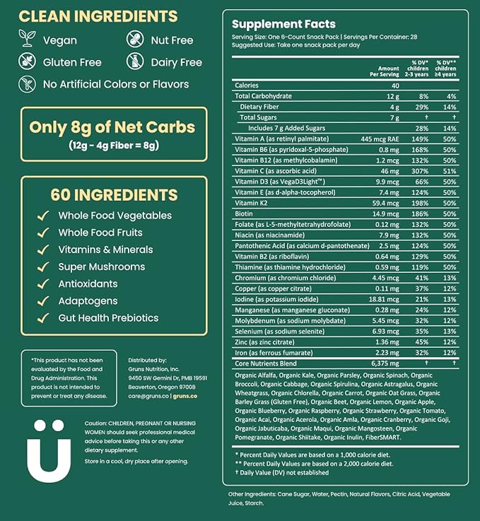 - Formulated to Fit Your Life: At Gruns, we believe that foundational nutrition should be simple and convenient for everyone. We’re dedicated to bringing comprehensive and complete nutrition to you through our gummies, formulated from 60 nutrient-dense and whole-food ingredients.