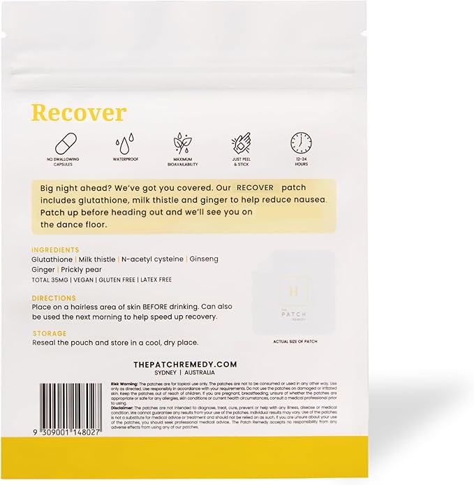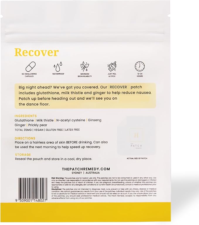 - RECOVERY PATCHES WITH INGREDIENTS TO COMBAT A BIG NIGHT - Loaded with powerful antioxidants and natural ingredients that are shown to work on common after-party symptoms like headaches, nausea, and fatigue. Recover Patch can be applied pre party and post party.