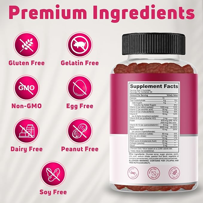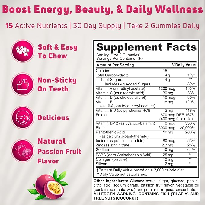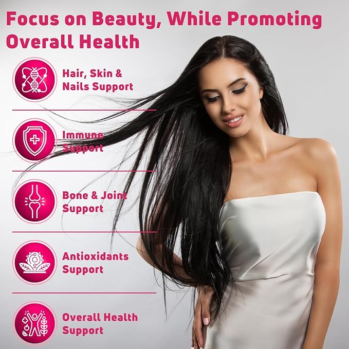 - Beauty Boosting Blend - Support your natural beauty from within with a powerful blend of biotin, collagen, and PABA, which work together to support vibrant appearance, enhancing your overall radiance and vitality for a more youthful, glowing look.