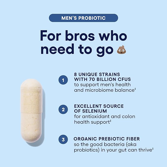 - Once Daily Probiotics for Men: Designed specifically to support men's digestive health and overall well-being. With 8 diverse strains (70B CFU) our probiotic and organic prebiotic blends supports a balanced microbiome, colon and immune health.