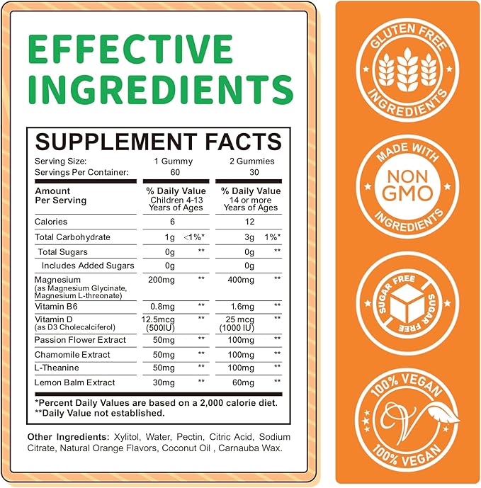 - Sugar Free, Pure & Delicious: Our Kids Magnesium Gummies are completely sugar-free and easy to chew, with a delicious orange flavor that everyone loves. Made from natural ingredients and free from artificial flavors, colors and preservatives, these gummies are vegan, non-GMO, and gluten-free. Provide health and happiness for your child with our delightful magnesium gummies (Ages 4-13 take 1 gummy, Ages 14+ & Adults take 2 gummies daily)!*