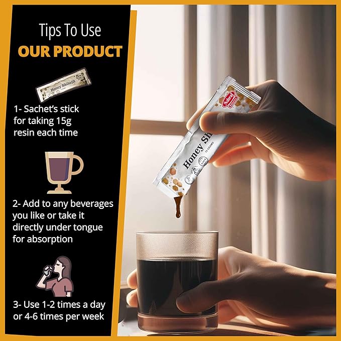- ββ ππππ πππ ππππππ: People often stress about how much Shilajit to take and in what quantity. They're unsure about the dosage. But now, you don't have to worry about that anymore. Each sachet already contains a one-time dosage, making it super easy. No more worries! Just tear open the sachet, pour it into a spoon, and take it. Or, mix it into lukewarm water, tea, or kahwa and savor its delicious flavor.