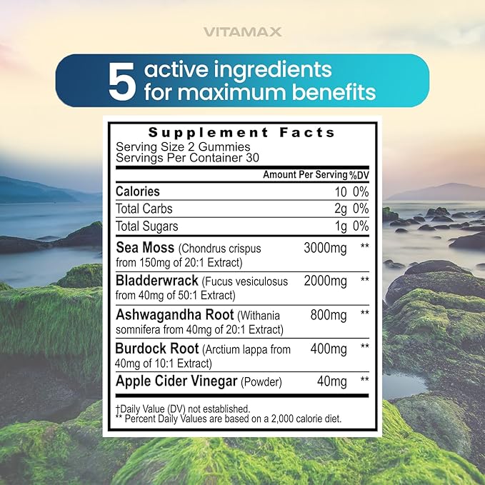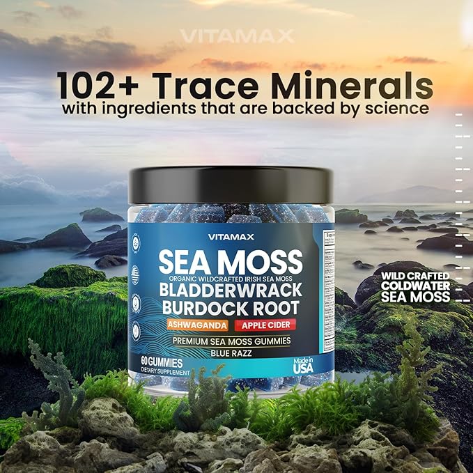 - Powerful All-in-1 Formula: Finally, a mineral supplement gummy that tastes good. Each serving delivers 3000mg of Irish Sea Moss, 2000mg of Bladderwrack, 800mg of Ashwagandha, 400mg of Burdock Root, and ACV to support overall wellness and vitality.