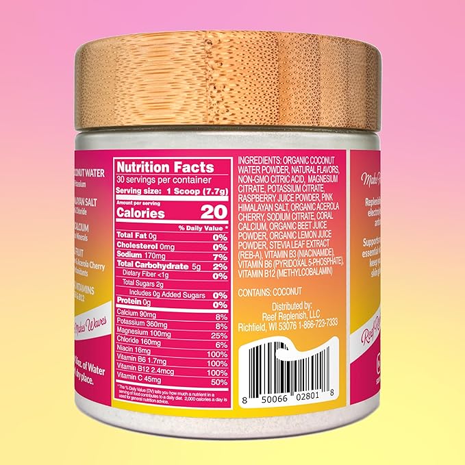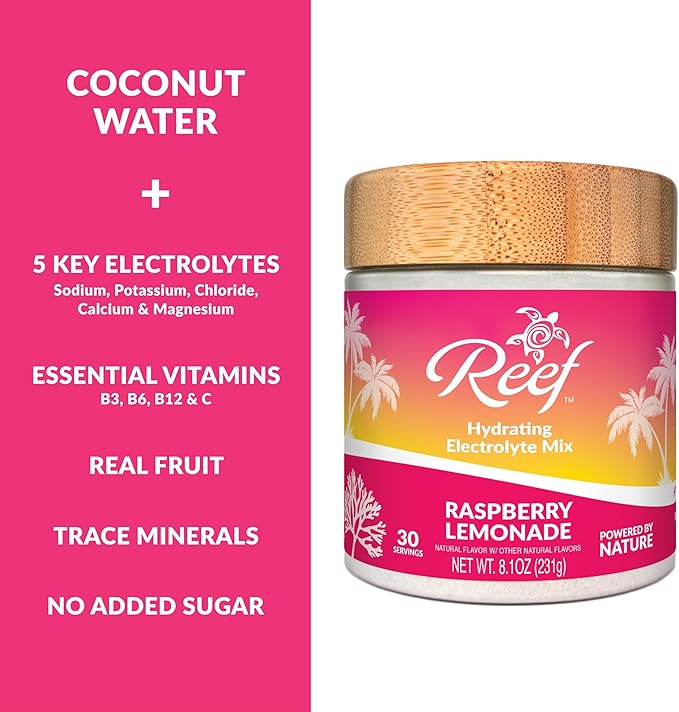 - ELECTROLYTE SUPPORT: Reef Replenish raspberry lemonade electrolytes powder includes five essential electrolytes—sodium, potassium, magnesium, calcium and chloride—to maintain ideal hydration levels and electrolyte balance.