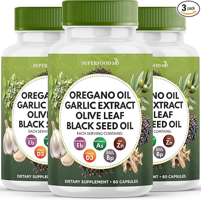 - Advanced Olive Leaf Extract Capsules and Oregano Oil Powder You Need - Superfood MD Olive Leaf all in one offers an immune support and gut health blend in one formula, combining four full-dose components: Oregano Oil, Black Seed Oil Capsules, and Sambucus Elderberry, all in a convenient 2-capsule serving. This all-in-one solution includes Garlic Supplement, Black Seed Powder, and Olive Leaf Extract for ultimate convenience and ease.