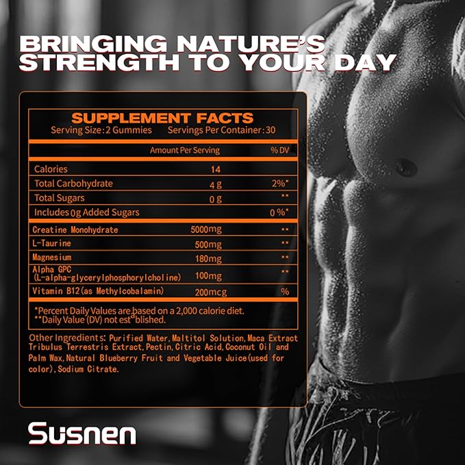 - Premium Formula,Maximum Efficacy: Our Creatine monohydrate gummies contains 5g pure creatine monohydrate per serving combined with L-Taurine, Vitamin B12, Magnesium and Alpha GPC for Maximum Benefits.