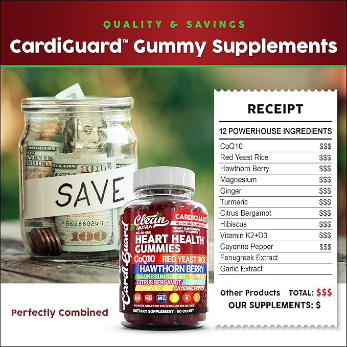 - Magnesium Glycinate Gummies: Cardi Guard coenzyme Q10 200mg. The inclusion of red yeast rice powder, cayenne pepper supplements, organic hawthorn berry, vitamin D3 5000 iu, CoQ10 200mg, garlic supplements, ginger supplements, and bergamot supplement provides a comprehensive combination. Turmeric and ginger supplement with even more!