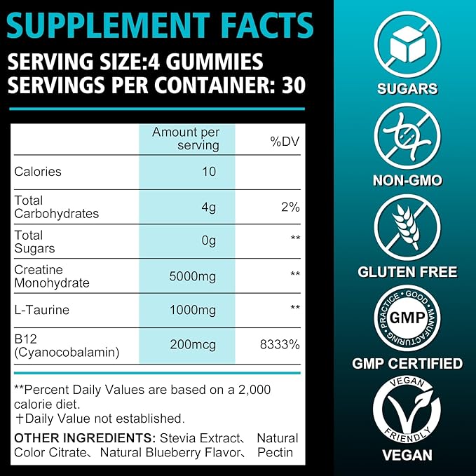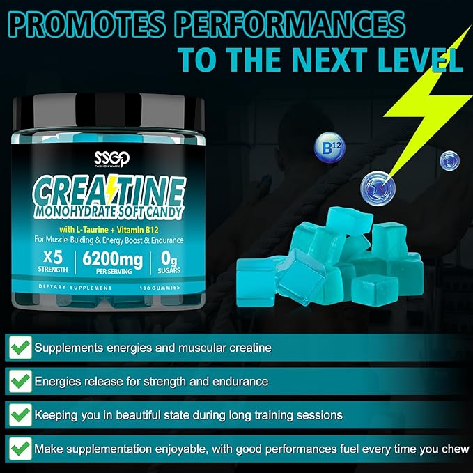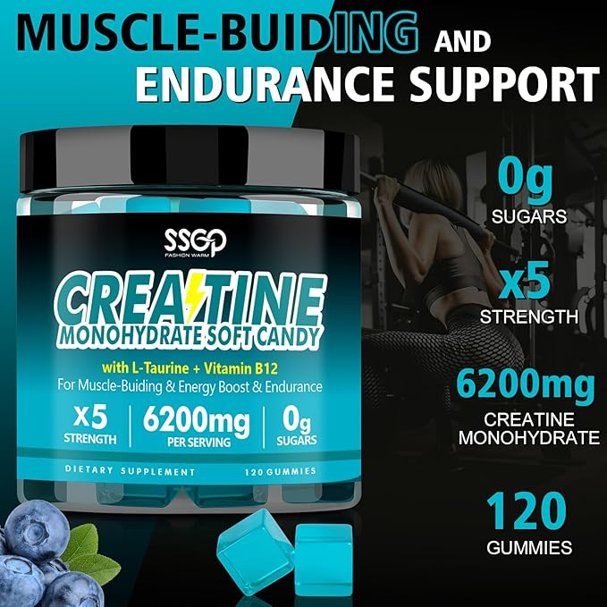 - Creatine Monohydrate 6200mg Gummies to Fuel Your Workout: 6200mg of Creatine Monohydrate per Serving. With L-Taurine and Vitamin B12. Whether you want to increase your strength and musclar during exercise or get as quickly as likelihood after a workout, our creatine soft candy unleash your energy and endurance to effectively improve and promote flesh building