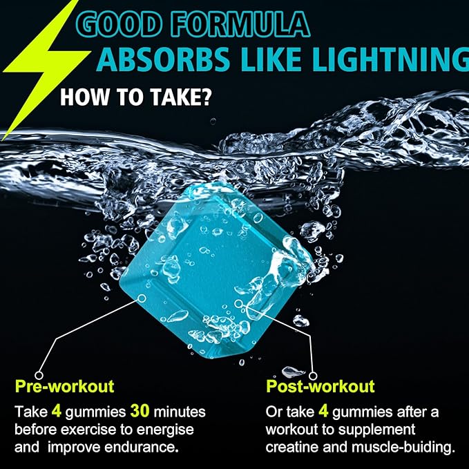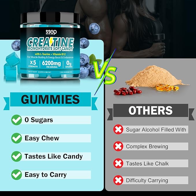 - Delicious Taste and Easy Absorption: Our creatine blueberry soft gummies say goodbye to the hassle of traditional messy powders and the complexity of capsule ingredients, and come in a tasty, convenient gummy form that's good for both men and women, and absorbs like lightning. With 4 gummies per serving, you can take them anytime, anywhere. It builds muscles strength, promotes muscles recovery, improves endurance and boosts energy