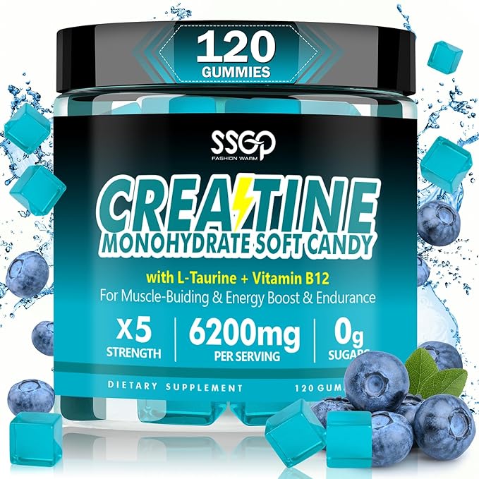 Creatine Monohydrate 6200 mg Soft Gummies for Men and Women - with Taurine and Vitamin B12, Enhances Energy -Muscular - Endurance - Vegetarian - Workout Supplement - Blueberry Gummies(120 Count)
