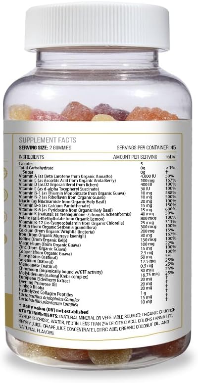 - The most complete and advanced organic gummy multivitamin with 25+ vitamins, minerals, and probiotics. All ingredients are sourced in the US. Contains macro and trace minerals that work together synergistically to support women age 60+.