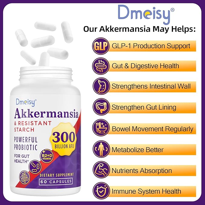 - Absolute Security For You: We stand by the purity and potency of our probiotic capsule and test it at each stage of production. Our 300 Billion AFU Akkermansia probiotic is 100% natural, non-gmo, no adhesive, gluten free, and vegan. Our Dmeisy 300 Billion AFU Akkermansia probiotic is a great choice for those looking to a diverse healthy microbiome, and get more GLP-1