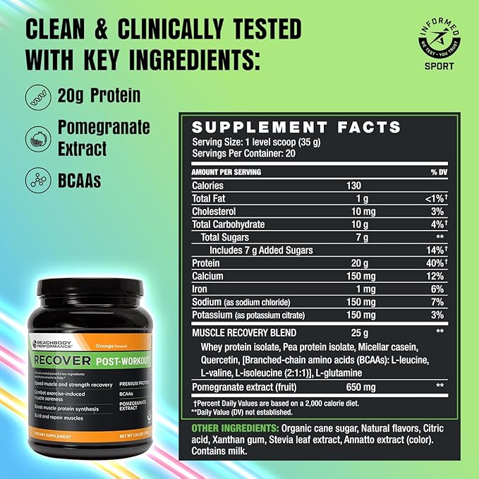 - PURE AND CLEAN NUTRITION: Enjoy an Informed Sport certified product with no synthetic colors, and no artificial flavors, sweeteners, or preservatives. With vegan options available, Beachbody Performance Recover offers a clean, trusted choice for enhancing post-workout recovery.*