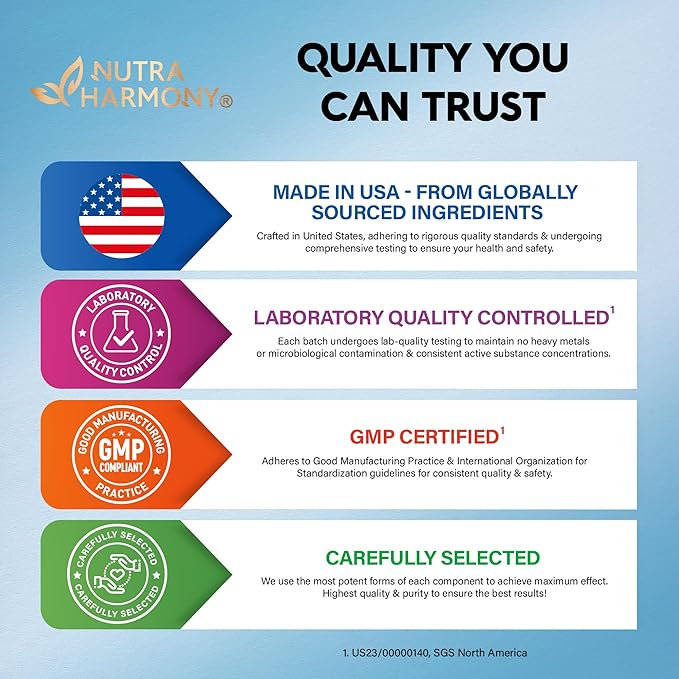 - Trustworthy Service — We are committed to providing exceptional customer service and transparency with NUTRAHARMONY’s carefully selected joint support supplements! With Glucosamine Chondroitin, you can trust that you're receiving a premium-quality supplement backed by scientific research and dedicated customer support!