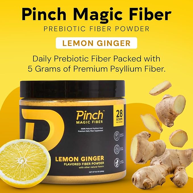 Pinch Magic Fiber | Prebiotic Fiber Supplement for Women & Men | Psyllium Husk Powder for Digestive & Gut Health Support | Keto, Vegan, Low Sugar Fiber Powder | USA-Made | Lemon Ginger, 28-Day Supply