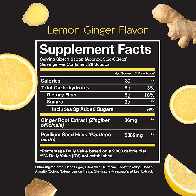 - Gut-Loving Lemon Ginger Fiber: Enjoy the bright, refreshing taste of prebiotic powder, enhanced by ginger root for digestive support and a smooth, citrusy flavor. Our fiber supplement powder has natural citric acid and turmeric, while 3g of organic cane sugar delivers just the right touch of sweetness.