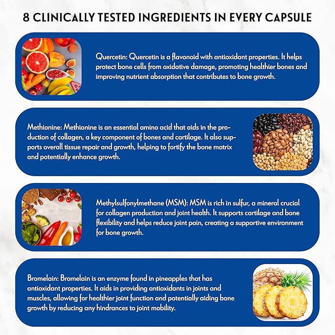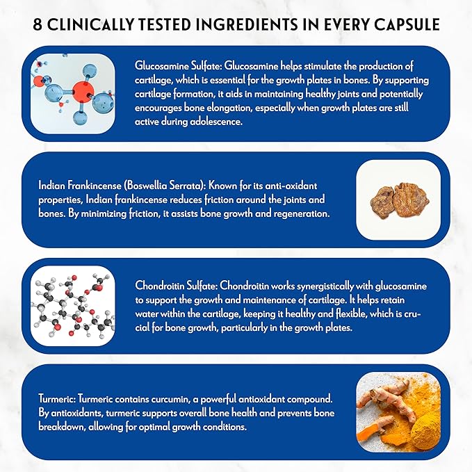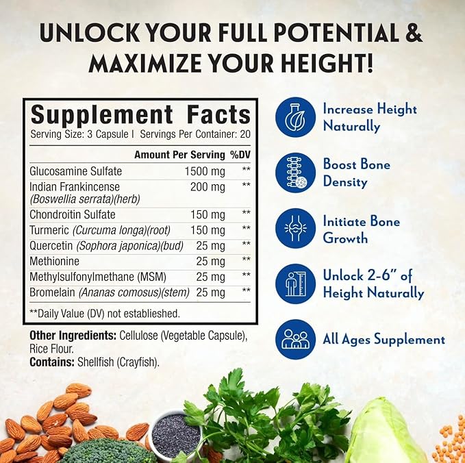 - [Promotes Bone Density and Strength for Long-Term Growth]: A critical aspect of height growth is bone health, and this formula includes Glucosamine, Quercetin, Bromelain plus 5 others to promote healthy bone density. These nutrients are vital for maintaining bone strength as you grow, reducing the risk of fractures, and supporting overall skeletal integrity.