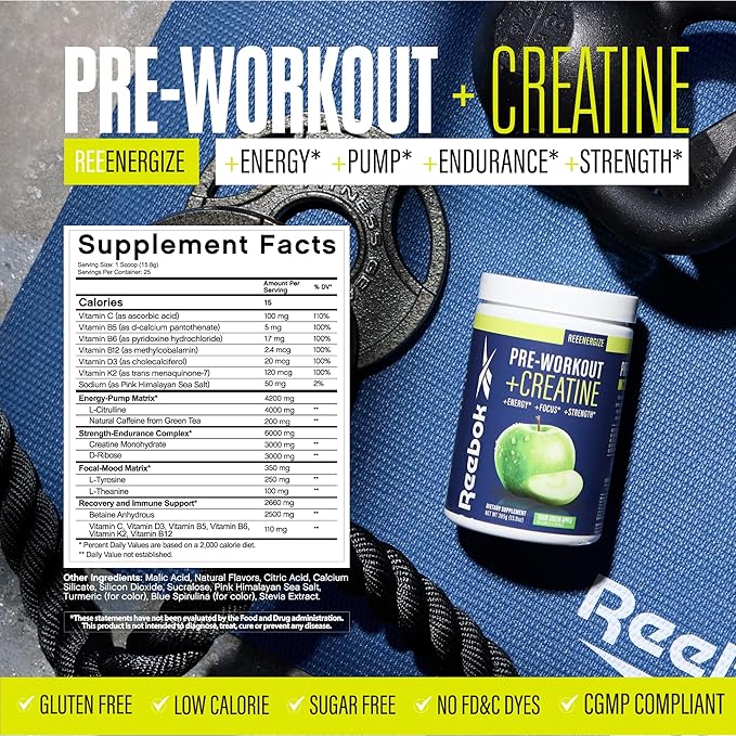 Reebok ReeEnergize Pre-Workout + Creatine | 200MG Caffeine, 3G Creatine, 4G Citrulline | Energy, Focus, Strength | Nitric Oxide Booster | 25 Servings | Sour Green Apple