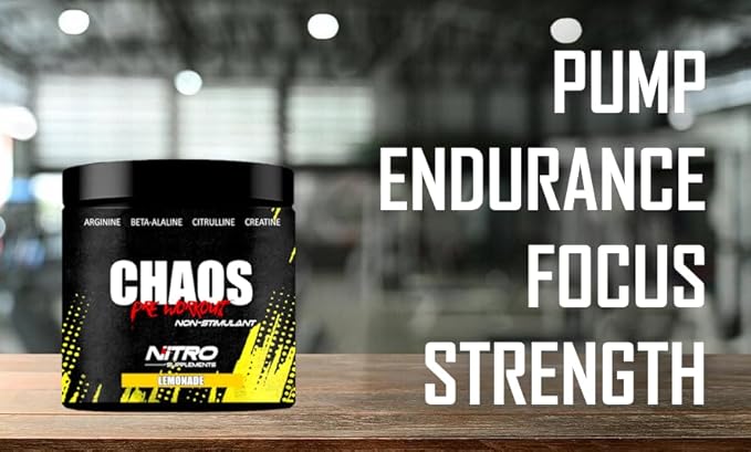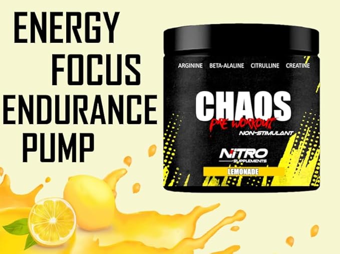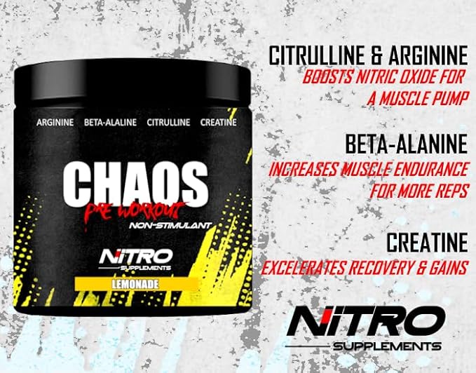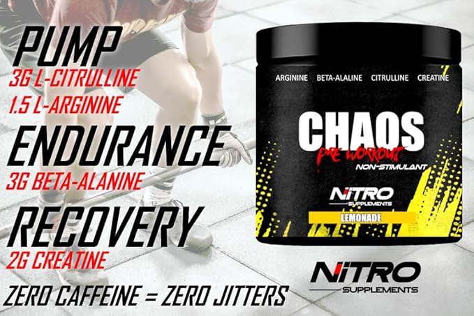 Nitro Supplements - Chaos - Non Stim Pre-Workout (30 Sevings) Beta-Alanine, L-Citrulline, Arginine, Creatine, Taurine Stim-Free Non-Stimulant (30 Servings, Lemonade)