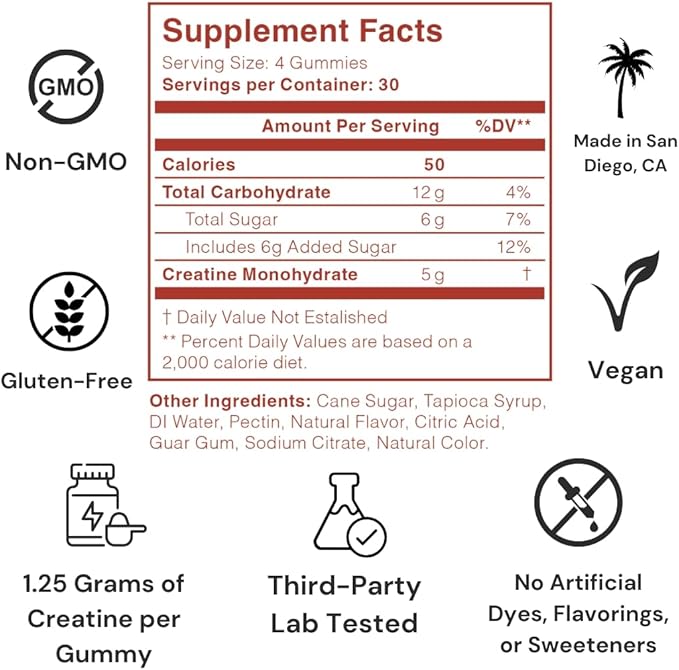 - SCIENTIFICALLY BACKED AND THIRD PARTY TESTED: We go the extra mile to ensure our creatine monohydrate gummies for men & women deliver a full 5000mg of creatine per serving, unlike some competitors who don't meet label claims. Grit-free and potent! NSF and GMP certified.