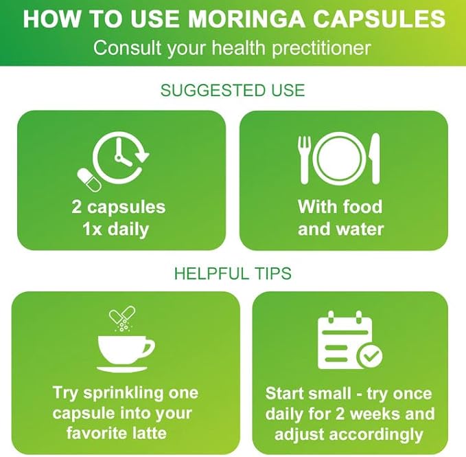 - Suggested Use - For optimal results, take our high-quality Moringa supplement filled with potent Moringa leaf powder. As a dietary supplement, adults can take 2 capsules once daily. Adjust your intake based on your body's needs. If you are on any medication, pregnant, or nursing, we recommend consulting with a doctor before use.