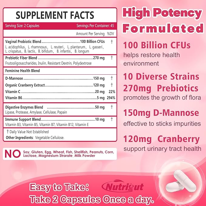 - High Potency Probiotic for Women - Nutrigut women's probiotics with 10 strains, 100 Billion CFUS probiotics to support digestive health. Each bottle provides up to 43-day supply. Target probiotics work on your target area for your digestive issues.