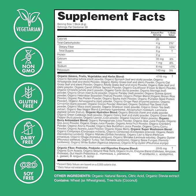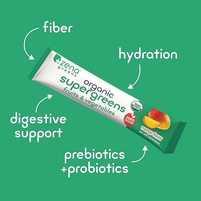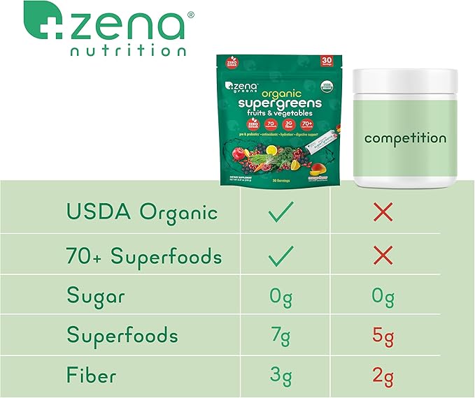 - ORGANIC SUPERGREEN BLEND: Enjoy a powerful boost of nutrition with Zena Greens Organic Super Greens Fruits & Vegetables. Each serving contains 7 grams of superfoods and 3 grams of fiber, featuring over 70+ super ingredients to support overall health and wellness. Packed with an extensive blend of organic greens, fruits, vegetables, herbs, super mushrooms, and essential prebiotics & probiotics with digestive enzymes, this supplement is designed to support your overall wellness and vitality.