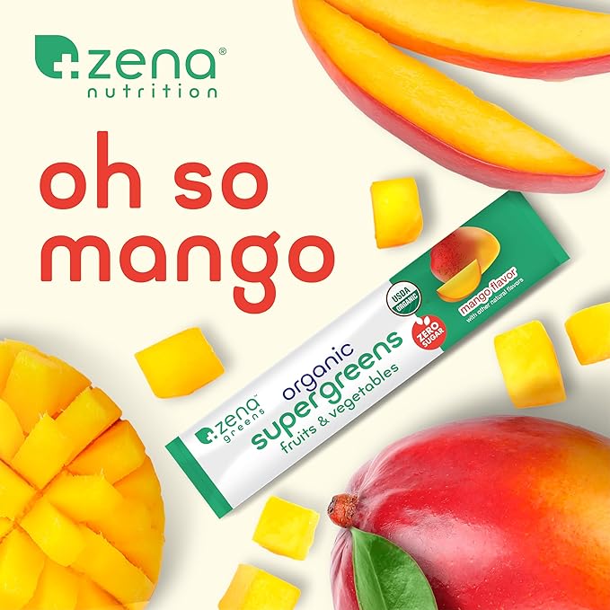 Zena Organic Super Greens Powder, 70+ Superfoods Drink Mix, 0 Sugar, 3G Fiber, Fruits, Veggies, Spirulina, Chlorella, Antioxidants, Pre & Probiotics, Digestive Enzymes, Mango Flavor, 30 Packets