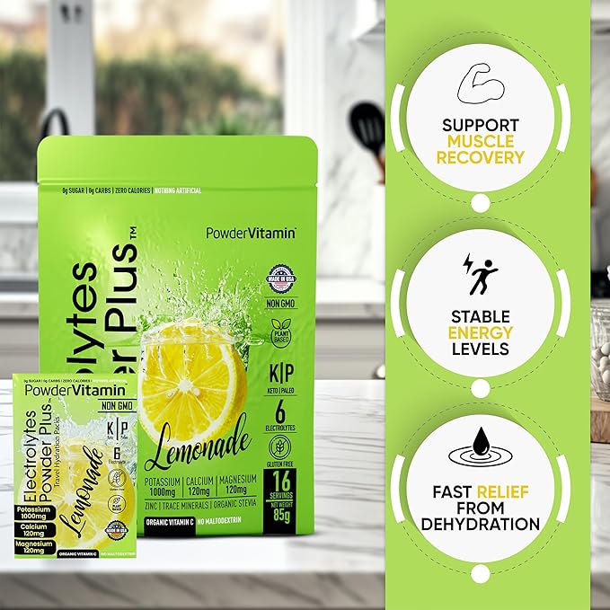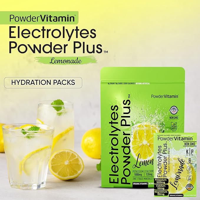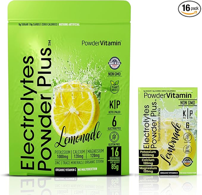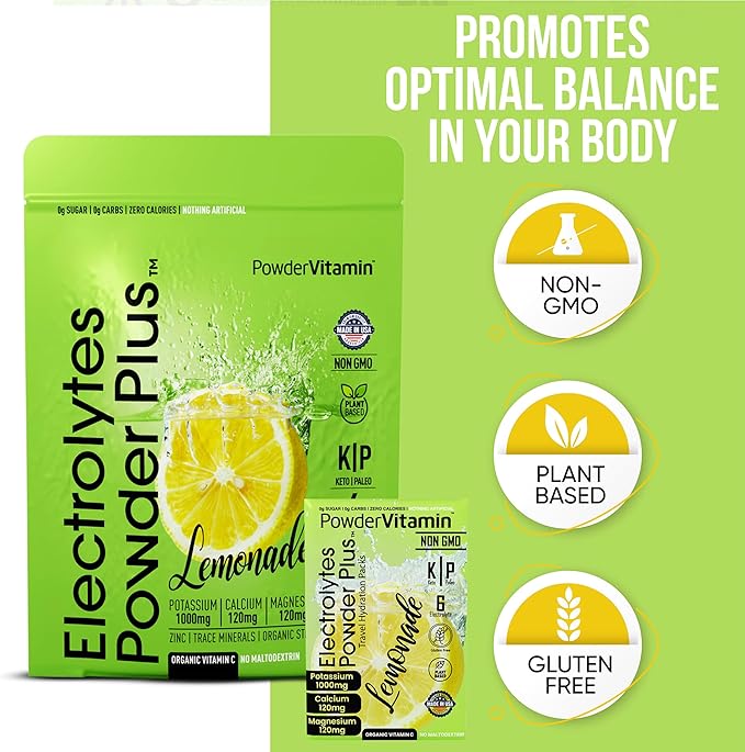- Electrolyte Powder - Electrolytes Powder Plus contains 1000 mg of potassium opposed to only 250 mg in other brands. Additional we offer a unique flavor and blend of Magnesium, Calcium, Organic Pink Himalayan salt. Our delicious and hydrating blend of Lemonade flavor includes 16 hydration packets for exercise, travel, or long nights. PowderVtmain Electrolytes Powder plus travel hydration packets has you covered.