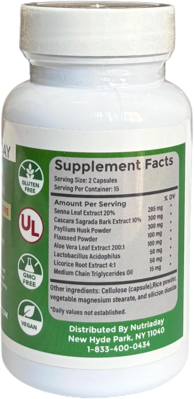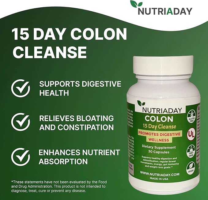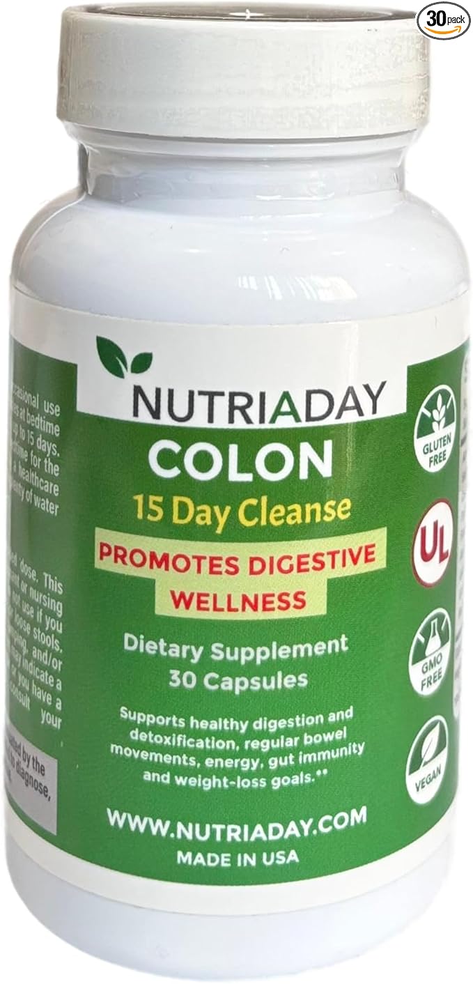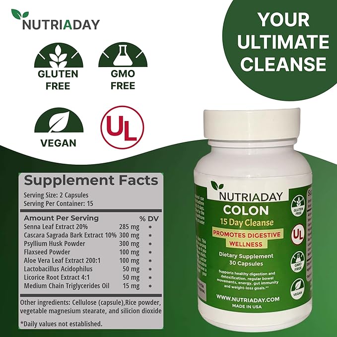 - NUTRIADAY’S COLON 15 DAY CLEANSE: is a Gluten-Free, Non-GMO, and Vegan Easy-to-Take Capsules. The ultimate Advanced 15-Day Gut Cleanse It has Powerful Herbal Ingredients which supports Digestive Health & Detox This potent formula is designed to support regular bowel movements, relieve constipation, and reduce bloating, leaving you feeling lighter and more energized. Key Ingredients: Senna Leaf: Known for its natural laxative properties, Senna Leaf helps stimulate bowel movements and relieve constipation. Cascara Sagrada Bark: This gentle, natural laxative works to cleanse the colon, promoting regularity and improving digestive health.