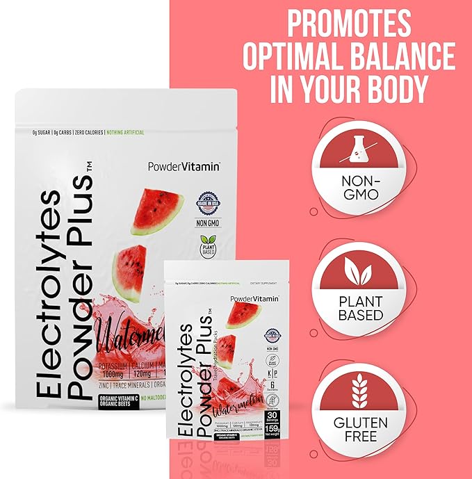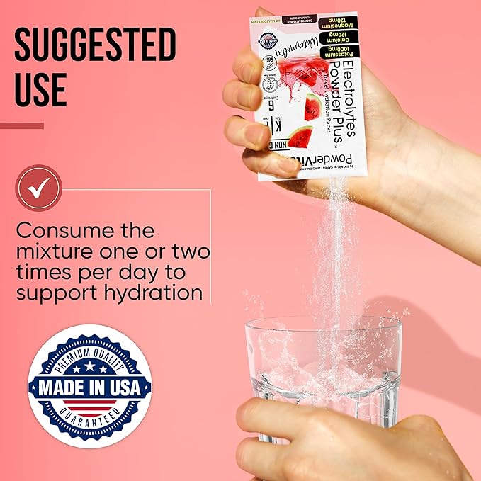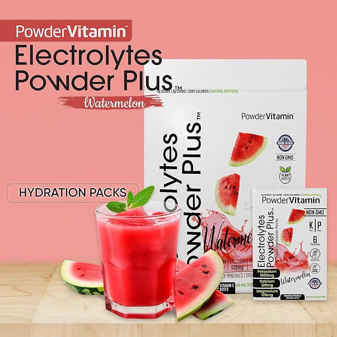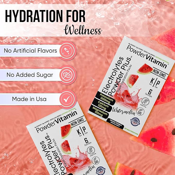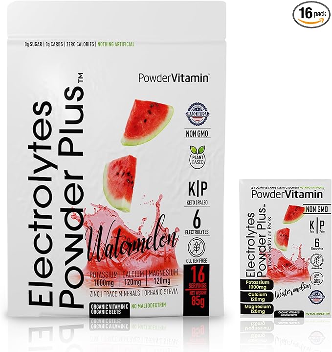 - Electrolyte Powder - Electrolytes Powder Plus contains 1000 mg of potassium opposed to only 250 mg in other brands. Additional we offer a unique flavor and blend of Magnesium, Calcium, Organic Pink Himalayan salt. Our delicious and hydrating blend of Watermelon flavor includes 16 hydration packets for exercise, travel, or long nights. PowderVtmain Electrolytes Powder plus travel hydration packets has you covered.