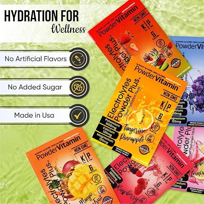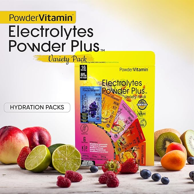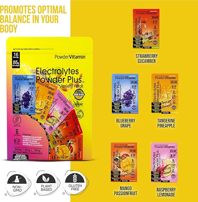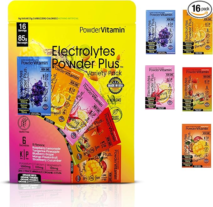 - Electrolyte Powder - Electrolytes Powder Plus contains 1000 mg of potassium opposed to only 250 mg in other brands. Additional we offer a unique flavor and blend of Magnesium, Calcium, Organic Pink Himalayan salt. Our delicious and hydrating blend of Variety Pack B flavor includes 16 hydration packets for exercise, travel, or long nights. PowderVtmain Electrolytes Powder plus travel hydration packets has you covered.