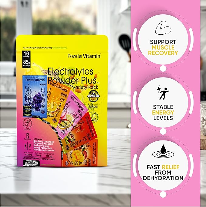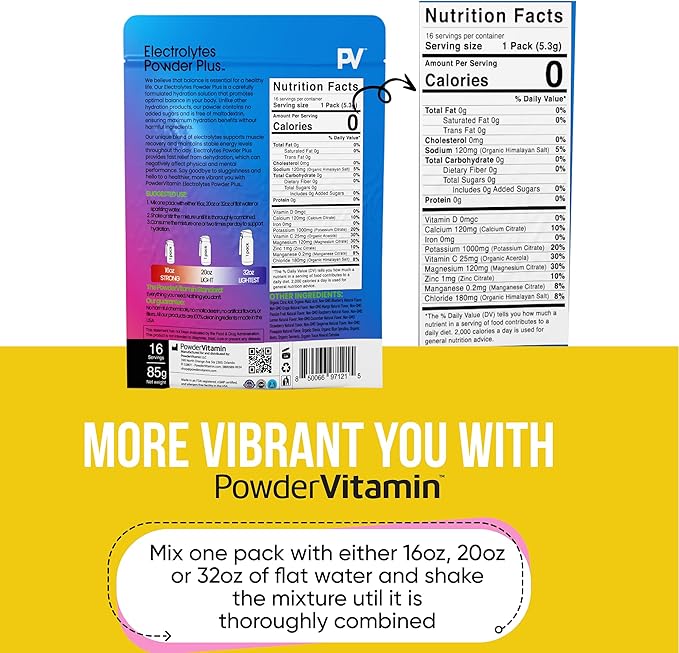 - Keep Yourself Hydrated – Without added calories. PowderVitamin Sugar-Free Electrolyte Powder Plus aids in per workout & post workout muscle recovery with potassium and essential mineral salts.