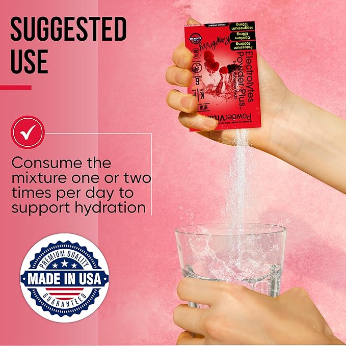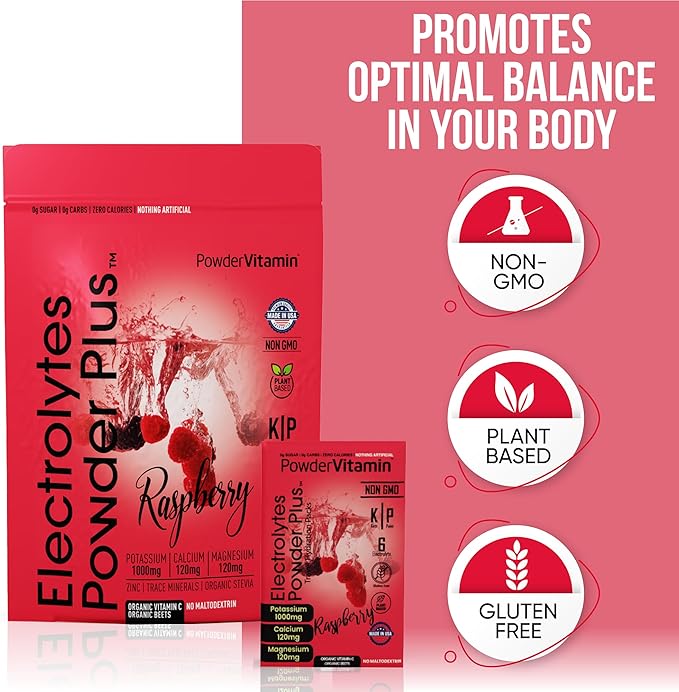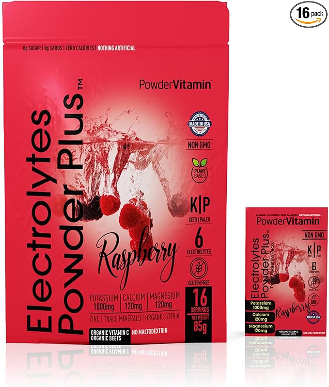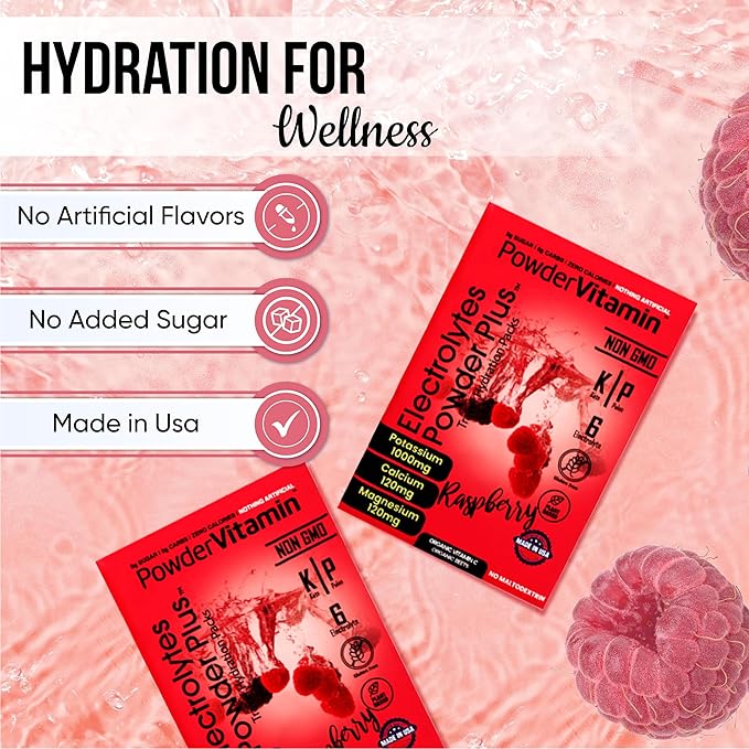 - Electrolyte Powder - Electrolytes Powder Plus contains 1000 mg of potassium opposed to only 250 mg in other brands. Additional we offer a unique flavor and blend of Magnesium, Calcium, Organic Pink Himalayan salt. Our delicious and hydrating blend of Raspberry flavor includes 16 hydration packets for exercise, travel, or long nights. PowderVtmain Electrolytes Powder plus travel hydration packets has you covered.