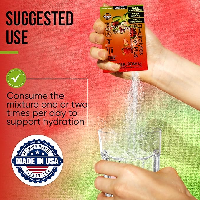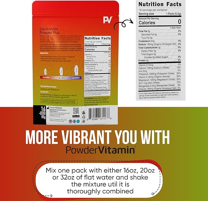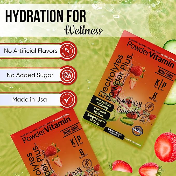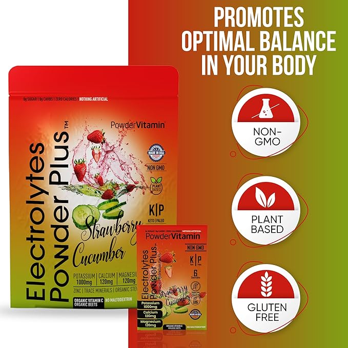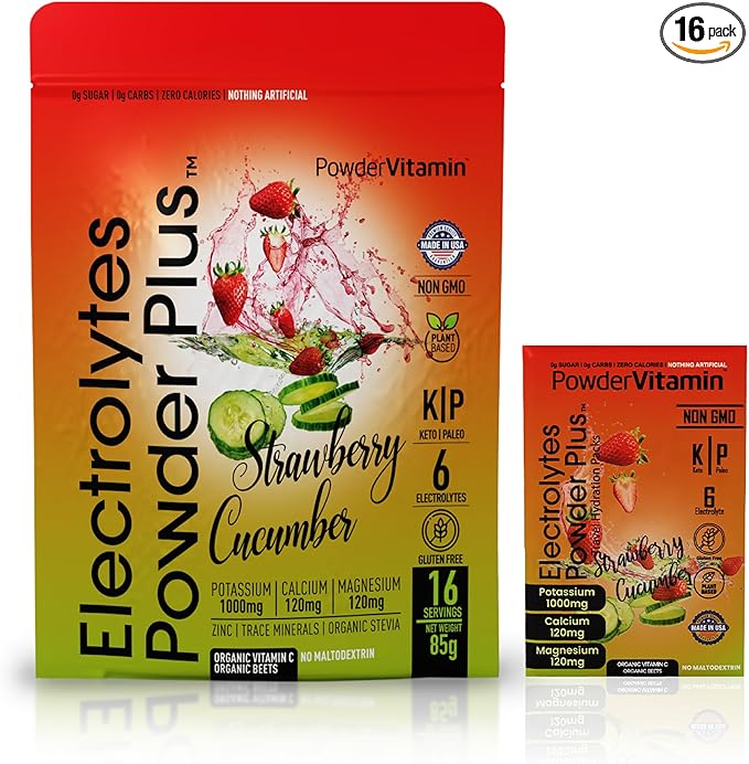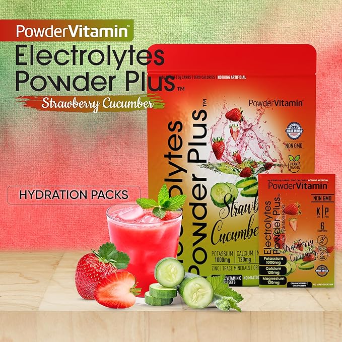 - Electrolyte Powder - Electrolytes Powder Plus contains 1000 mg of potassium opposed to only 250 mg in other brands. Additional we offer a unique flavor and blend of Magnesium, Calcium, Organic Pink Himalayan salt. Our delicious and hydrating blend of Strawberry Cucumber flavor includes 16 hydration packets for exercise, travel, or long nights. PowderVtmain Electrolytes Powder plus travel hydration packets has you covered.