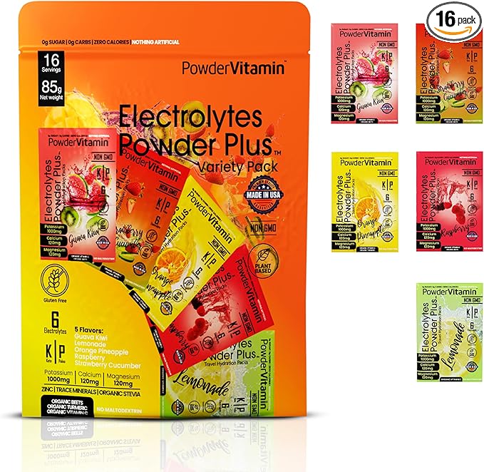 - Electrolyte Powder - Electrolytes Powder Plus contains 1000 mg of potassium opposed to only 250 mg in other brands. Additional we offer a unique flavor and blend of Magnesium, Calcium, Organic Pink Himalayan salt. Our delicious and hydrating blend of Variety Pack A flavor includes 16 hydration packets for exercise, travel, or long nights. PowderVtmain Electrolytes Powder plus travel hydration packets has you covered.