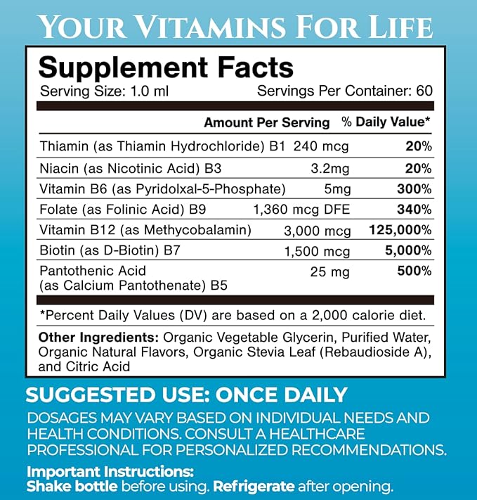 Superdose Organic Vitamin B Complex Liquid Drops | 125,000% DV Vitamin B12, B6, Biotin, Niacin, Folate | Energy, Brain Health, Immune Support | USDA Organic, Vegan, Non-GMO | 60 Serv, 2 Mo. Supply