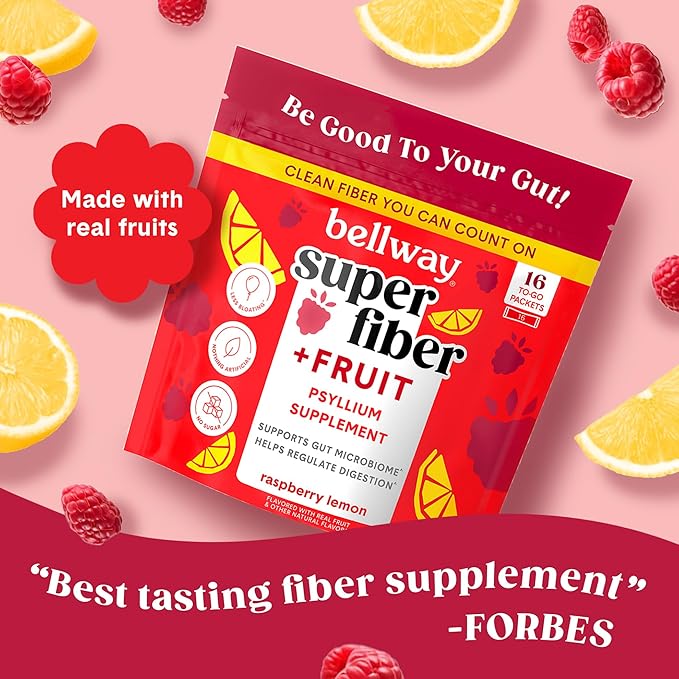 Bellway Super Fiber Packets + Fruit, Sugar Free Organic Psyllium Husk Powder Fiber Supplement to Go for Regularity, Bloating Relief & Gut Health, Non-GMO, Plant-Based, Raspberry Lemon (16 Packets)