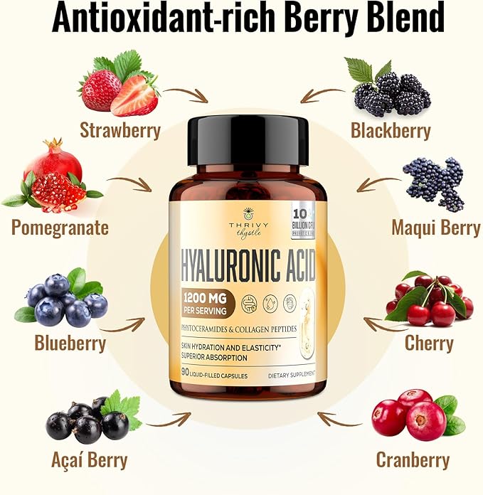 - 11 Berry Blend: Hyluronic Acid Contains Açaí Berry, Goji Berry, Blueberry, Pomegranate, Strawberry, Raspberry, Blackberry, Elderberry, Maqui Berry, Cherry, and Cranberry. Hyaluronic Acid Capsules Slow Down Cell Damage, Delay Aging, and Strengthen the Immune System