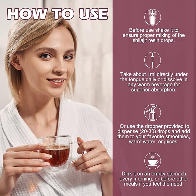 - 【 WELL-BEING LIFE OF SHILAJIT SUPPLEMENT】: Shilajit resin liquid drops are also free from any artificial colors, flavors, or fillers, making it a good and trusted choice for those looking for a natural way to boost their health. Just take 1 ml of shilajit resin drops directly daily to provide needed nutrients. Take shilajit resin in warm water or add it to your favorite beverage, preferably with a meal, for optimal results and Easy to absorb and nourish your body for your overall wellness.