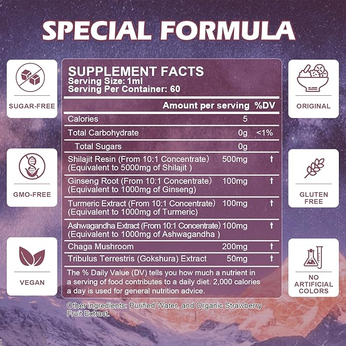 - 【6-In-1 FORMULA OF SHILAJIT SUPPLMENT】: Our formula is a comprehensive combination of Shilajit Pure Himalayan, Ashwagandha, Panax Ginseng Root, Turmeric, Chaga Mushroom, Tribulus Terrestris, enriched with 6 potent ingredients. It offers an abundance of benefits which are ideal dietary supplements shilajit for men and women. Maximum strength Shilajit supplement formula contains 5000mg of Shilajit resin extract per serving. You'll not only boost your productivity, but you'll be able to enjoy a better life.