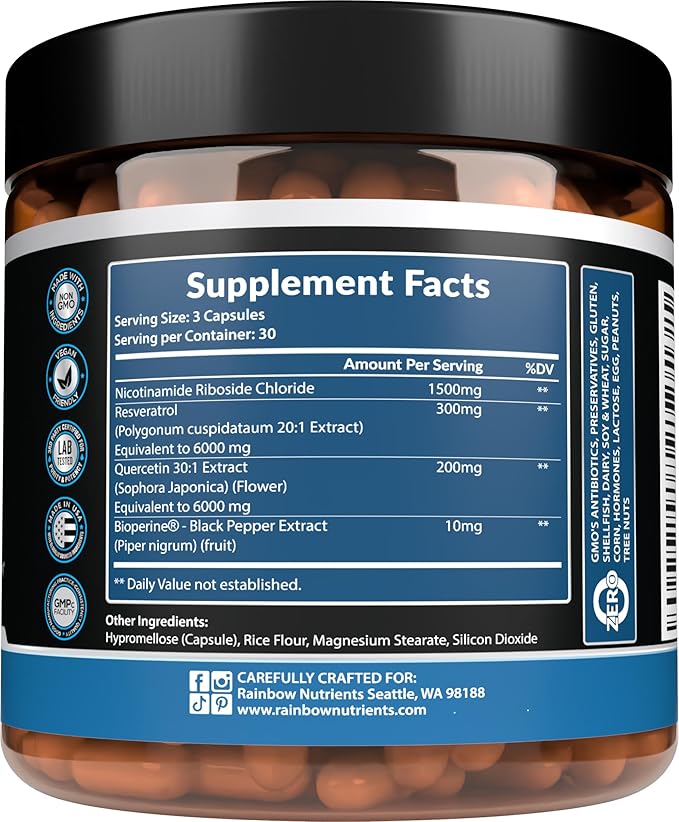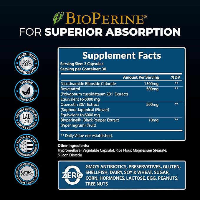 - INGREDIENTS MATTER - Did you know regular NAD supplements has poor bio-availability and your body may only absorb 10% of the nutrients with minimal to no benefit? Our proprietary formula includes 1500mg of Nicotinamide Riboside, 6000mg Resveratrol, 6000mg Quercetin & BioPerine to ensure max nutrient absorption for maximum results!